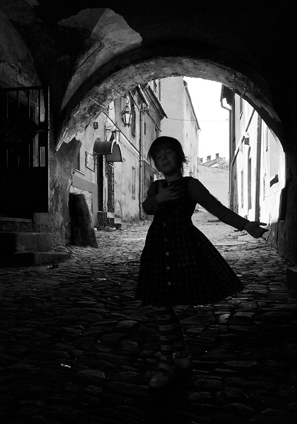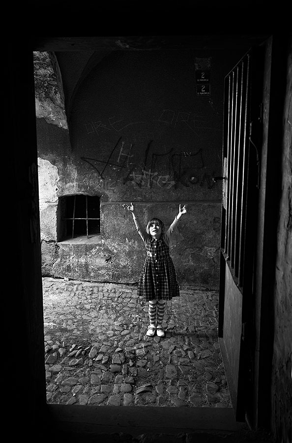 Mimo pogodnego dnia w starych bramach panuje półmrok. Tańczące dziecko w głębokim cieniu wypełnia swoją postacią jasną część kadru. Kontrast buduje tu scenę, a dotknięte znakiem czasu fragmenty kamienicy dopełniają ją.